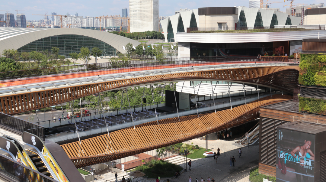 前灘太古里延續(xù)了“太古里”開(kāi)放式的建筑布局,“雙層開(kāi)放空間”(Double-open park concept)、80米長(zhǎng)的“悅目橋”(Scenic Bridge)讓觀者可以一覽城市風(fēng)景。