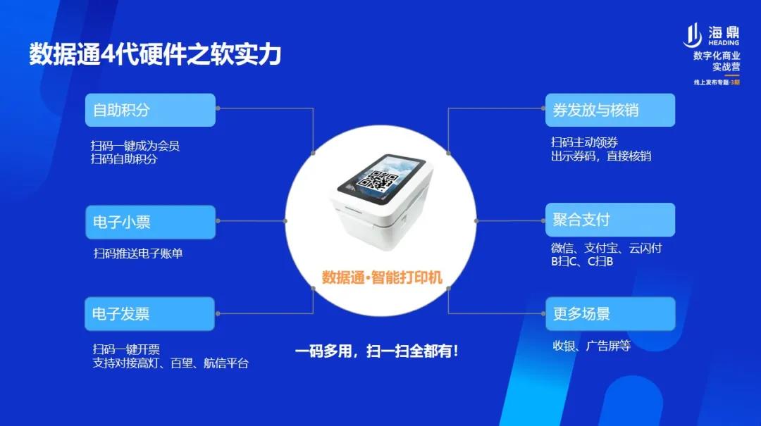 在軟件實(shí)力方面,數(shù)據(jù)通4.0產(chǎn)品集成了支付功能、電子小票、會(huì)員招募、電子發(fā)票、券發(fā)放與核銷等多項(xiàng)功能,支持在移動(dòng)端或設(shè)備上直接配置。