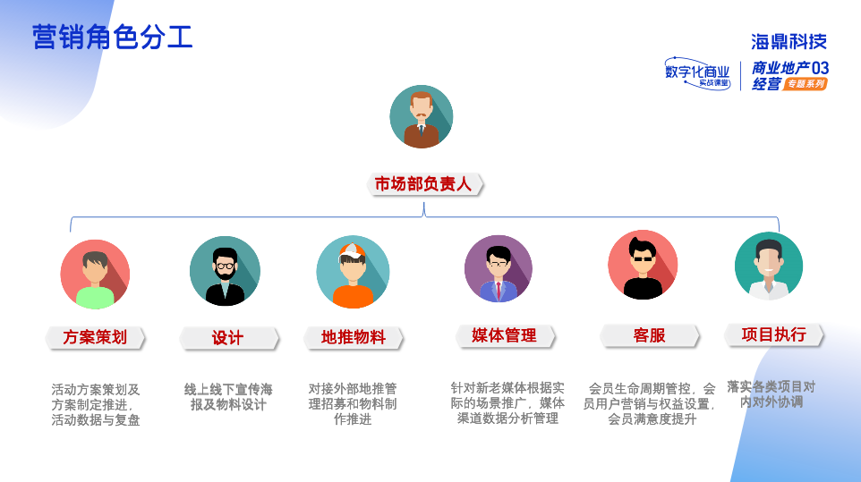 首先,我們要回歸到營銷本身,每個商場的營銷活動主要由商場市場部(企劃部)牽頭,對項目各項活動的對外形象進行全面把控,并主要由以下六種角色共同配合,開展營銷運營。