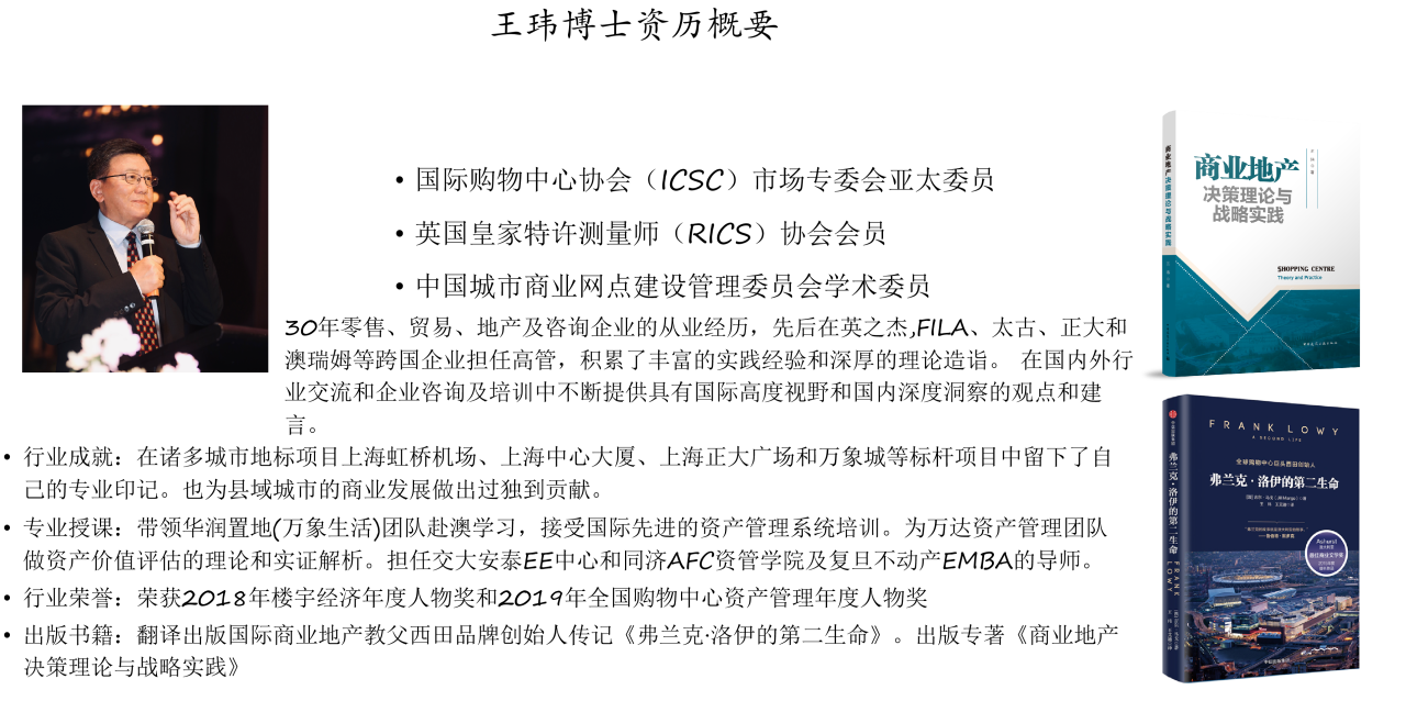 中國(guó)商業(yè)地產(chǎn)工委碳中和工作處處長(zhǎng)崔銘先生主持本次培訓(xùn)課程,國(guó)際購(gòu)物中心協(xié)會(huì)市場(chǎng)專委會(huì)亞太委員王瑋博士作為課程主講嘉賓進(jìn)行主題分享。王瑋博士擁有30年零售、貿(mào)易、地產(chǎn)及咨詢企業(yè)的從業(yè)經(jīng)歷,曾在英之杰、FILA、太古、正大和澳瑞姆等跨國(guó)企業(yè)擔(dān)任高管,積累了豐富的實(shí)踐經(jīng)驗(yàn)和深厚的理論造詣。同時(shí),王瑋博士還翻譯出版了國(guó)際商業(yè)地產(chǎn)教父西田品牌創(chuàng)始人傳記《弗蘭克·洛伊的第二生命》,出版專著《商業(yè)地產(chǎn)決策理論與戰(zhàn)略實(shí)踐》,為商業(yè)地產(chǎn)全行業(yè)帶來了全新的國(guó)際高度視野與國(guó)內(nèi)深度洞察。