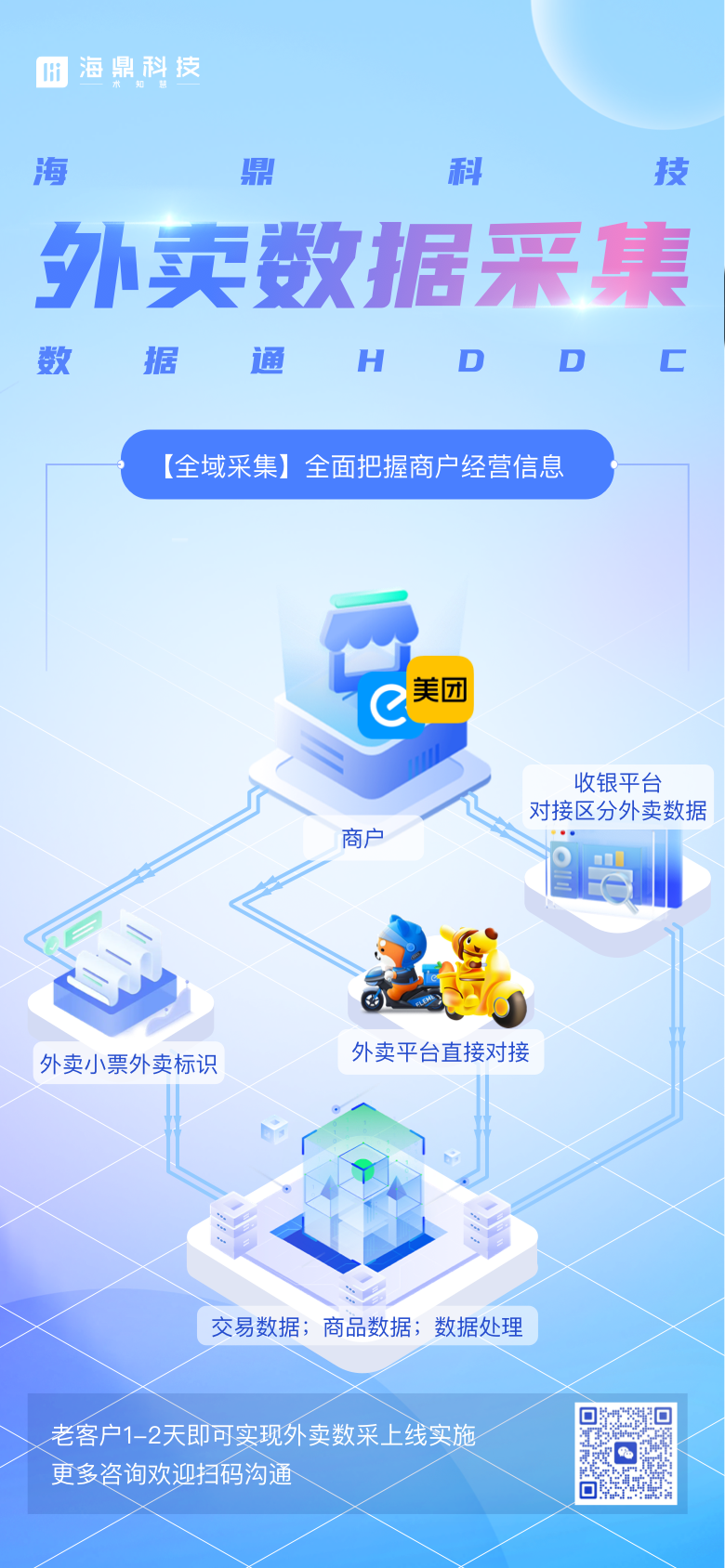 外賣數(shù)據(jù)通產(chǎn)品植根于海鼎科技數(shù)據(jù)通平臺(tái),目前已對(duì)接美團(tuán)、餓了么兩大主流外賣平臺(tái),外賣數(shù)據(jù)的獲取和存儲(chǔ)均滿足外賣平臺(tái)的安全合規(guī)要求。結(jié)合傳統(tǒng)的外賣小票采集方式,目前的外賣數(shù)據(jù)通產(chǎn)品可高效、精準(zhǔn)實(shí)現(xiàn)商戶外賣數(shù)據(jù)的采集工作。對(duì)于有需求的數(shù)據(jù)通老客戶,只需1-2個(gè)工作日即可更新上線。