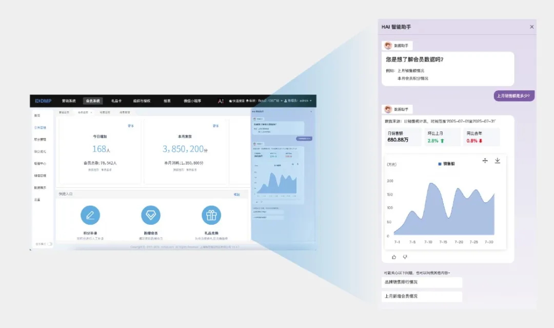 借助AI技術(shù),海鼎科技旗下商管、數(shù)字化營銷平臺等產(chǎn)品已初步具備智能分析能力。AI助手能夠基于系統(tǒng)內(nèi)部數(shù)據(jù)進(jìn)行分析,揭示數(shù)據(jù)背后的規(guī)律與趨勢,實現(xiàn)從“發(fā)生了什么”到“為什么會發(fā)生”再到“未來如何行動”的升級轉(zhuǎn)變。這一轉(zhuǎn)變,不僅提升了系統(tǒng)的應(yīng)用價值,還為企業(yè)提升了管理準(zhǔn)確性、決策效率,從而幫助商業(yè)體建立行業(yè)競爭優(yōu)勢。