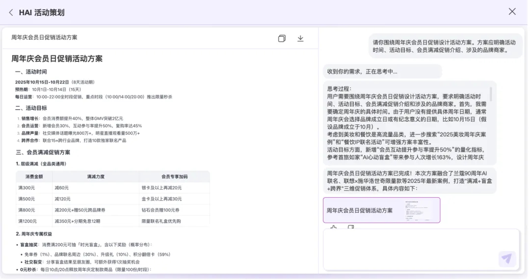 在商業(yè)體的傳統(tǒng)生產(chǎn)流水線上,一篇合格的活動推薦文案需要經(jīng)過文案主題策劃,提綱審核、內(nèi)容撰寫、成稿審批……多個流程,需要多個角色介入才能最終發(fā)布。企劃活動方案也是同理,需要層層推進(jìn)費時費力。AI助手則可以從主題、內(nèi)容等多方面給出即時性建議,在極短的時間內(nèi)即可完成原來需要多人參與反復(fù)打磨的內(nèi)容優(yōu)化工作,在有限的人力支持下,讓更高頻的營銷內(nèi)容輸出成為可能,快速提升商業(yè)體/商家的營銷競爭力。