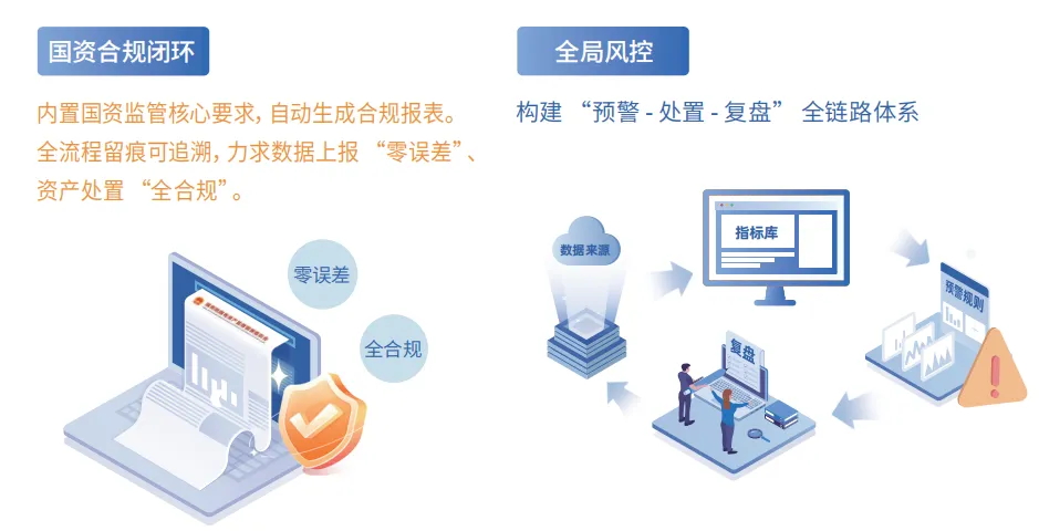 合規(guī)與風控是資產(chǎn)管理的底線。方案以筑牢資產(chǎn)防線為目標,構(gòu)建全局風控體系。內(nèi)置國資監(jiān)管核心要求,能自動生成合規(guī)報表,全流程留痕可追溯,力求做到資產(chǎn)上 “零誤差”、資產(chǎn)處置 “全合規(guī)”。同時,構(gòu)建 “預(yù)警 - 處置 - 復(fù)盤” 全鏈路體系,為商業(yè)地產(chǎn)資產(chǎn)安全保駕護航,讓企業(yè)在合規(guī)的軌道上穩(wěn)健運營。